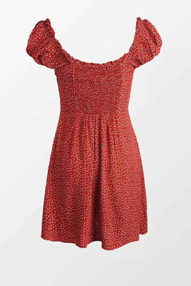 Feel super cute in our Alessandra Ditsy Frill Short Dress. Features with frill in the neckline, fitted waist. Smocking on the back for perfect fit on any body shape.