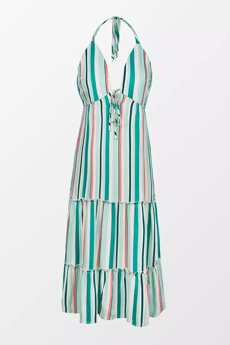 Get the party started, and look great while you do it in the Alondra Stripe Frill Halter Neck Elastic Waisted Slip Dress. Wide back cutout is accented with a gathered, elasticized strap. Create a casual and fashionable style for you.