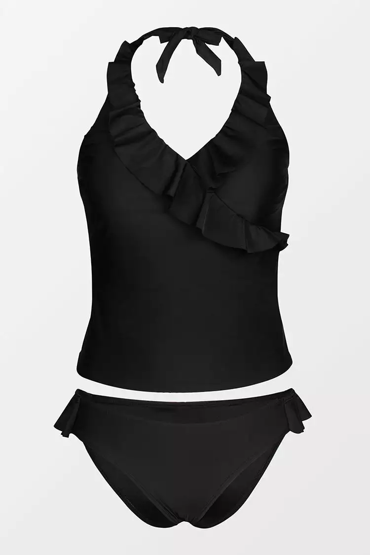 Our Angelique Black Ruffle Halter Tankini is the perfect bathing suit for the beach. Solid ruffle tankini top brings some comfort in the sun. Low waisted bikini bottom shows off your curves.