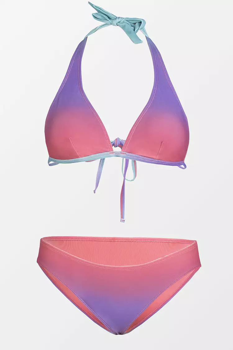Classic silhouette with a customizable fit, the tall halter bikini top lets you adjust your best fit with adjustable halter ties and a back tie. The ombre print reminds us of a beautiful sunset by the ocean.