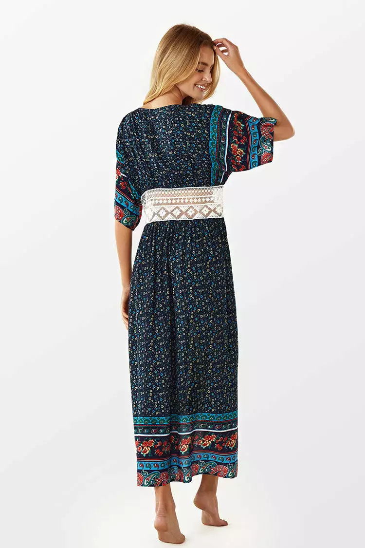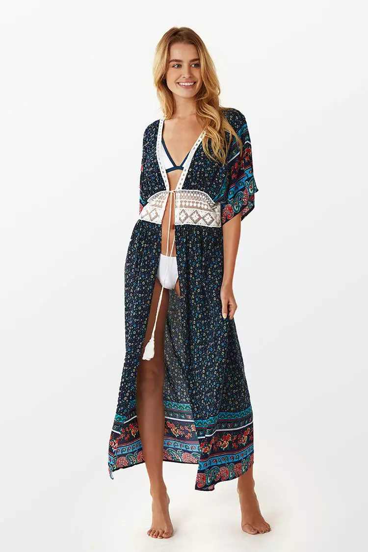 Add a bit of boho glam to your next vacation with the Boho Crochet Kimono Cover Up. The self-tie design and crocheted lace at the waist and neckline make this a coverup to wear on and off the beach.
