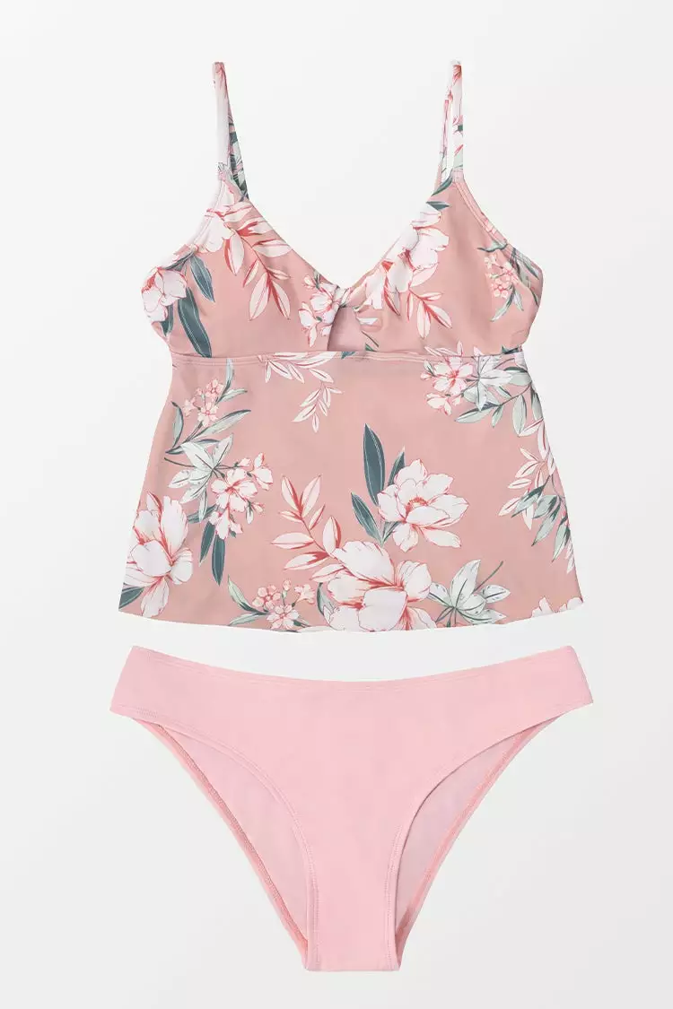 Feel super cute in our Breana Floral V-neck Cut Out Low Waisted Tankini. Thin straps fall to v-neckline and a cut out in the middle. Low waist hipster for the matching bottom.