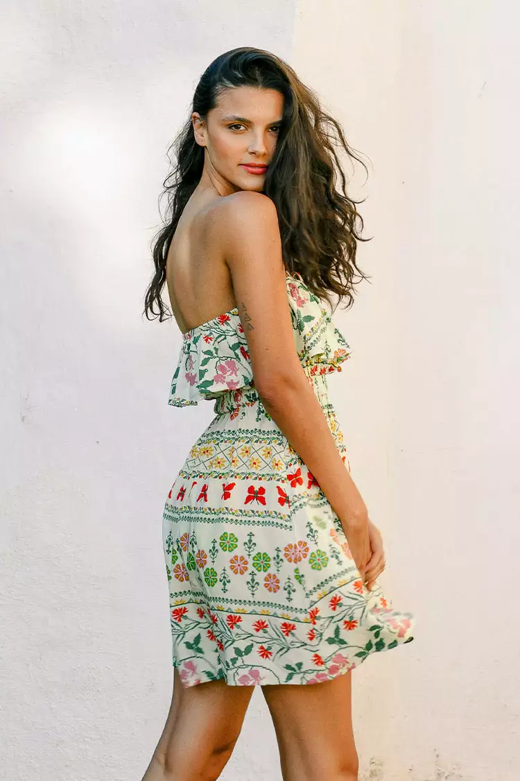 Our Bristol Cute Floral Ruffle Dress gives off a fun garden party vibe. This strapless dress features a floral garden print with an elastic waistband and flirty ruffle trim.