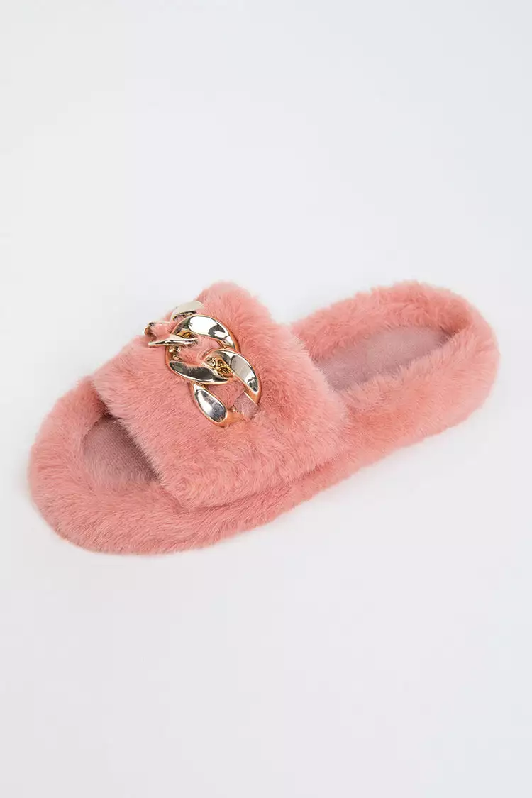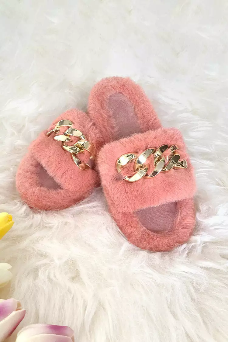 Our Brownstone Orange Fluffy Chain Decor Slippers are so comfy that it is always the ultimate pleasure to wear them. Suitable for indoor and outdoor. Metal ornaments are very interesting and beautiful!