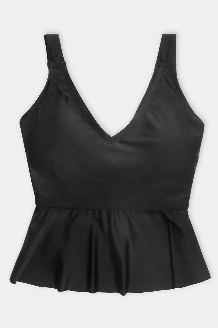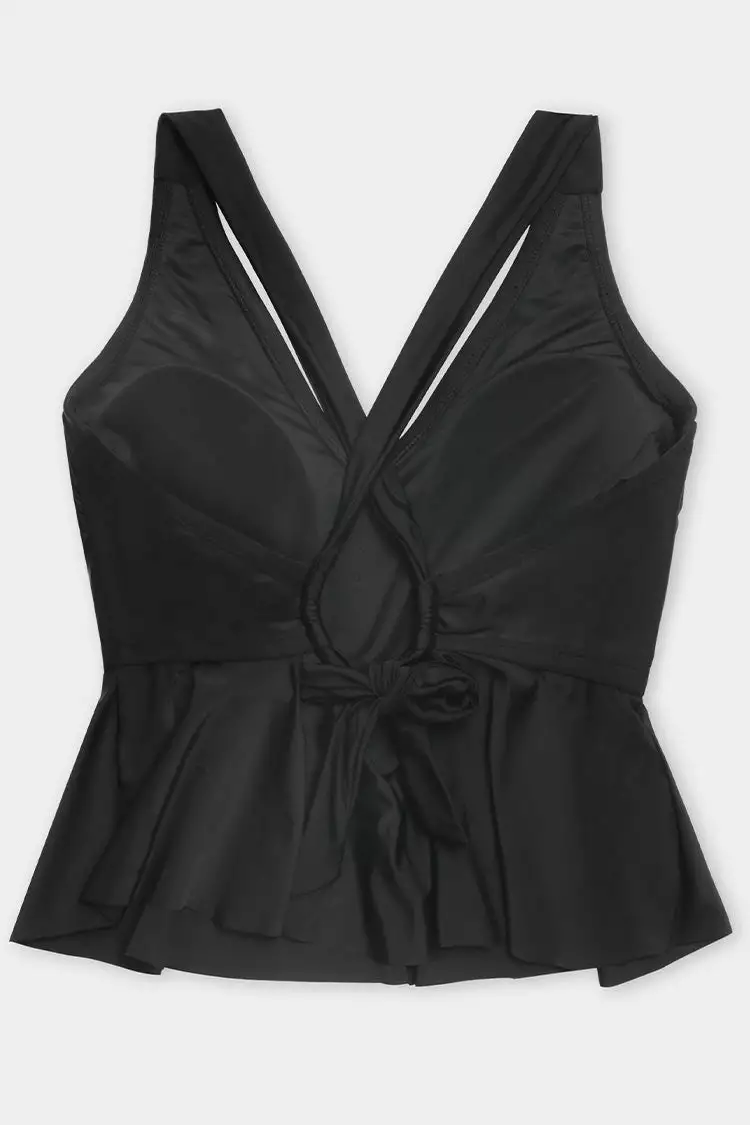 Pretty peplum updates this sophisticated Charmed Romance Cropped Peplum Plus Size Tankini Top. The tankini top features a V neckline and a crisscross back tie closure.