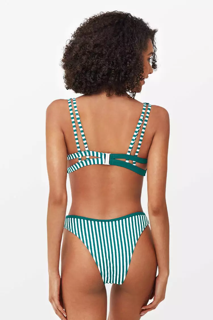 Our Ellie Striped Knot Front Bikini is super cute and flattering on all body shapes. The striped bikini top has adjustable wide straps front and thin straps back . Knotted at the front adds a little fun. The matching striped bikini bottom has a mid waist fit.