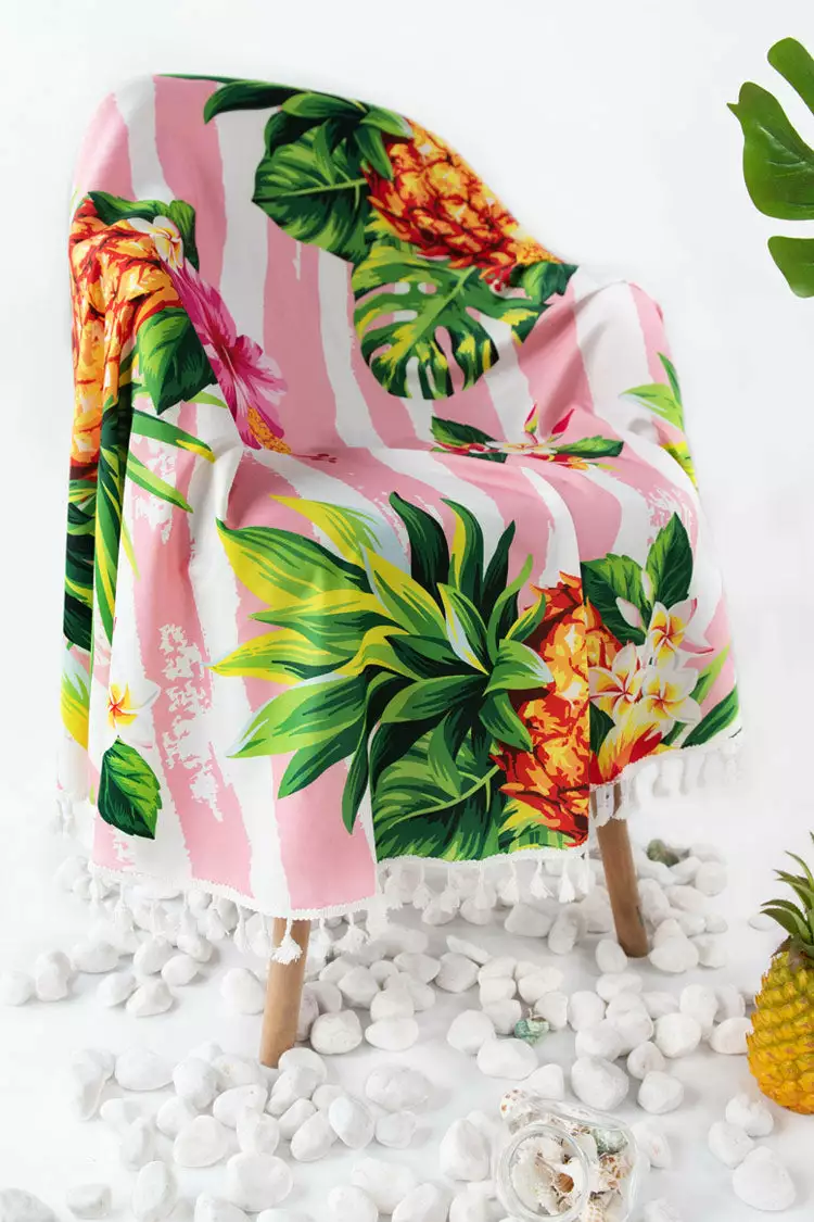 Get ready to lay out on this Floral and Pineapple Print Round Beach Blanket. This soft round blanket is trimmed with tassels. This vibrant beach blanket is the ultimate beach accessory.
