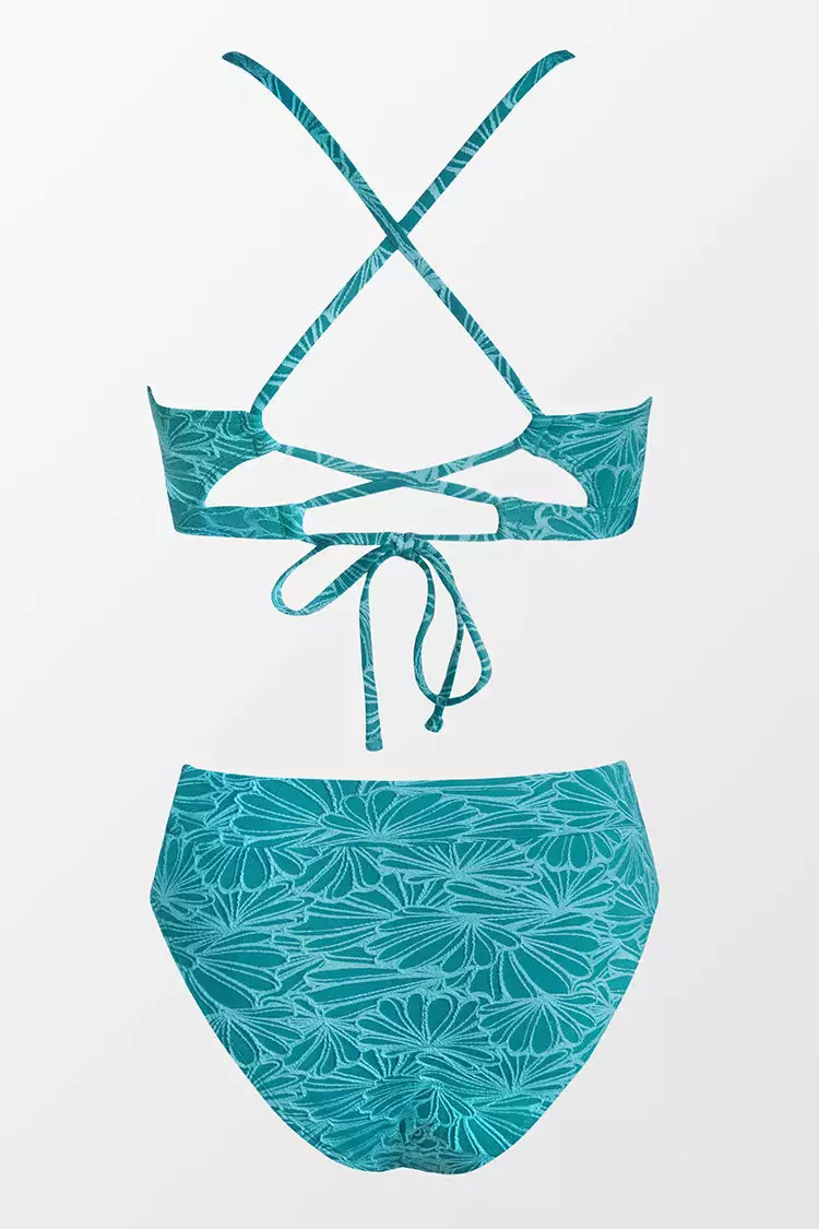 The bralette top brings charm with floral jacquard and scalloped edges. The matching bikini bottom has a banded waist for a fitted look.