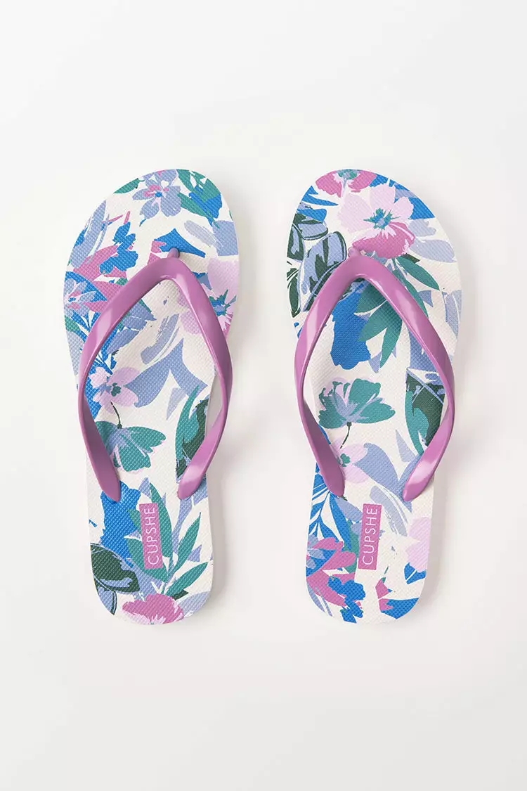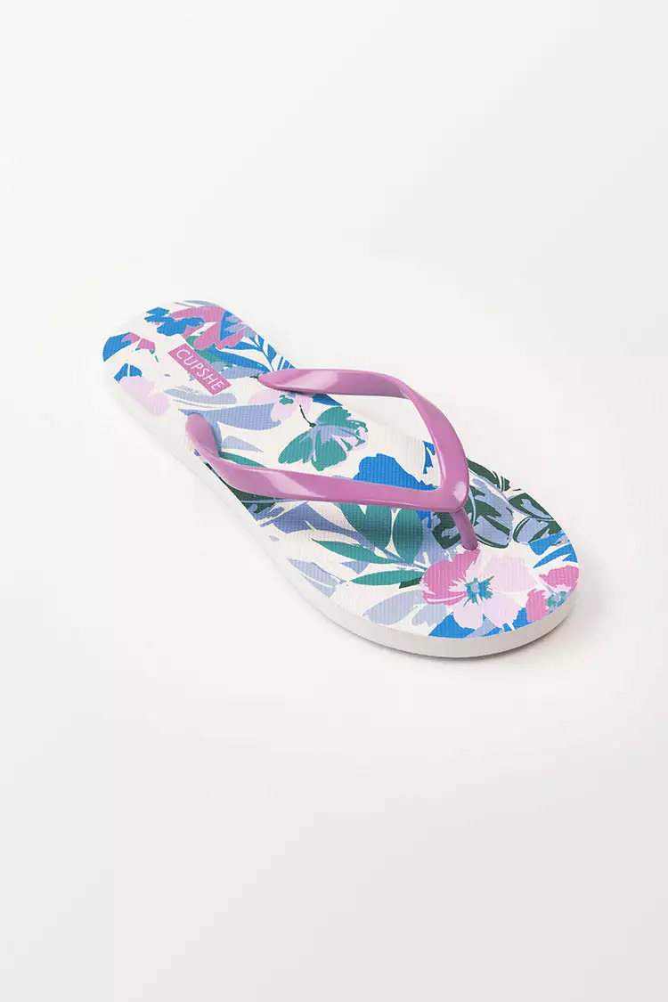 Our Flowerburst Floral Flip Flops is a classic flip-flop sandals make for a summer wardrobe staple; Easy slip-on design with open toe and strapless back; Comfy sole with no heel for easy wear; Floral pattern design meets your swimsuit and summer outfit matching needs.