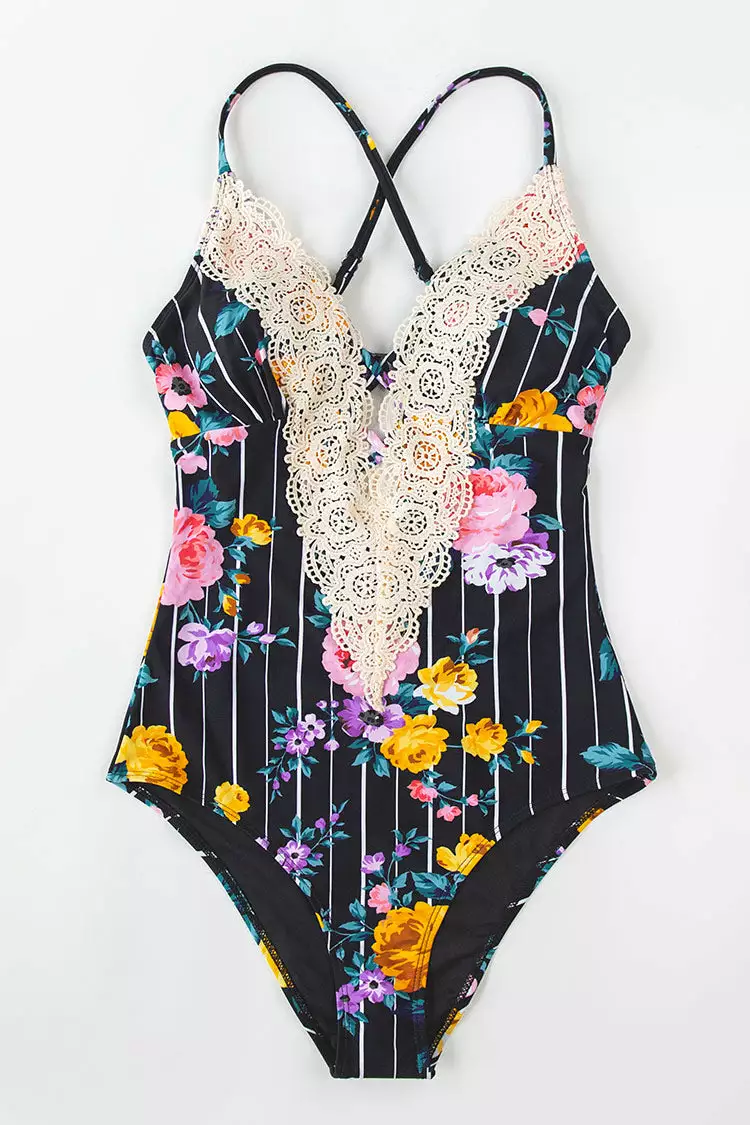 The Francesca Black Floral Plunge Neck Crisscross One Piece Swimsuit brings playful style and functionality to your swim collection. Features a contrast lace plunging neckline with crisscross back straps.