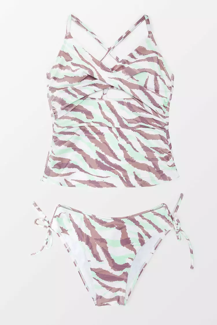 This Halie V-neck Cut Out Low Waisted Tankini will be your new favorite set to show off! Adjustable crisscross thin straps tied on the back. Cut out and drawstring detail add a touch of fun. The bottom features with low rise.