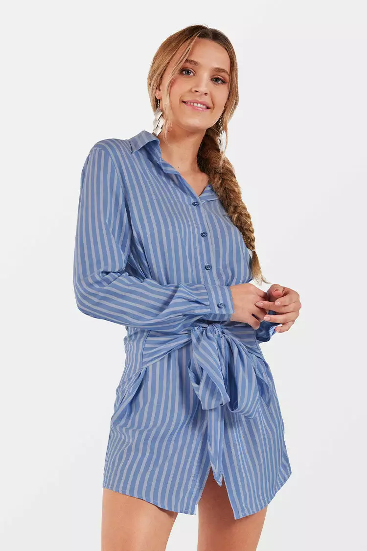 This Hillary Stripe Tie Front Shirt Dress is casual chic. Features button front and a tie at the waist that can be adjusted. This perfect dress to wear from office hours to happy hour!