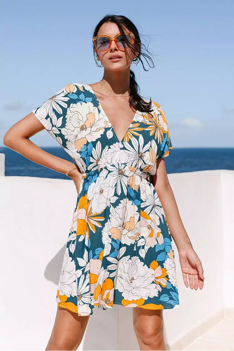 Add a little glamour to your next beach escape with the Jena Floral V-neck Dress. Features v-neck and tie at back with elastic waist.