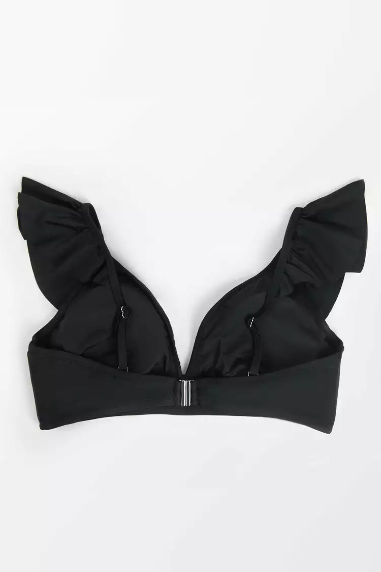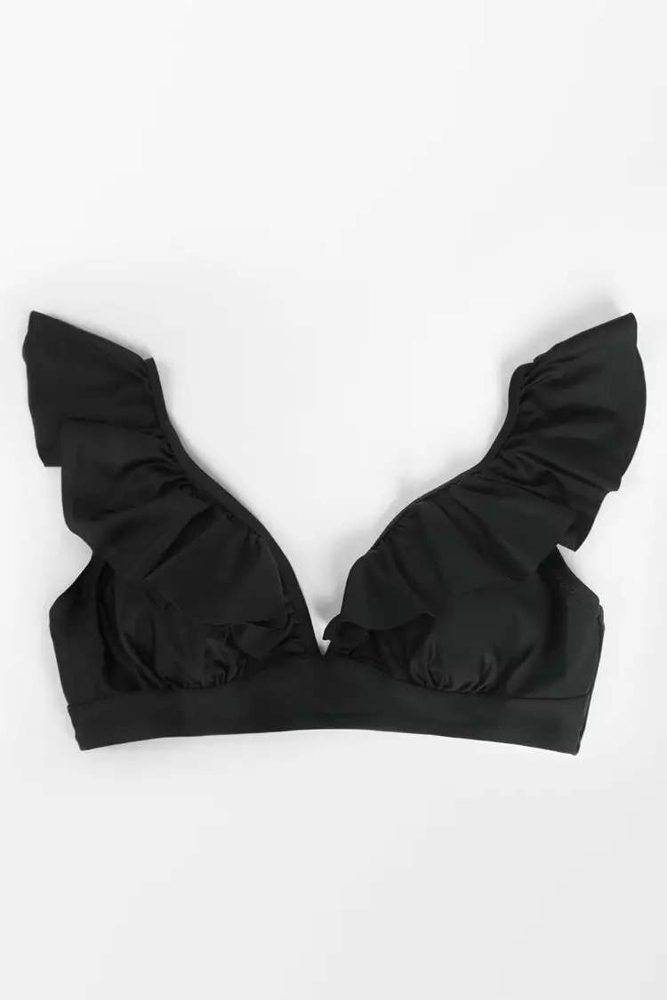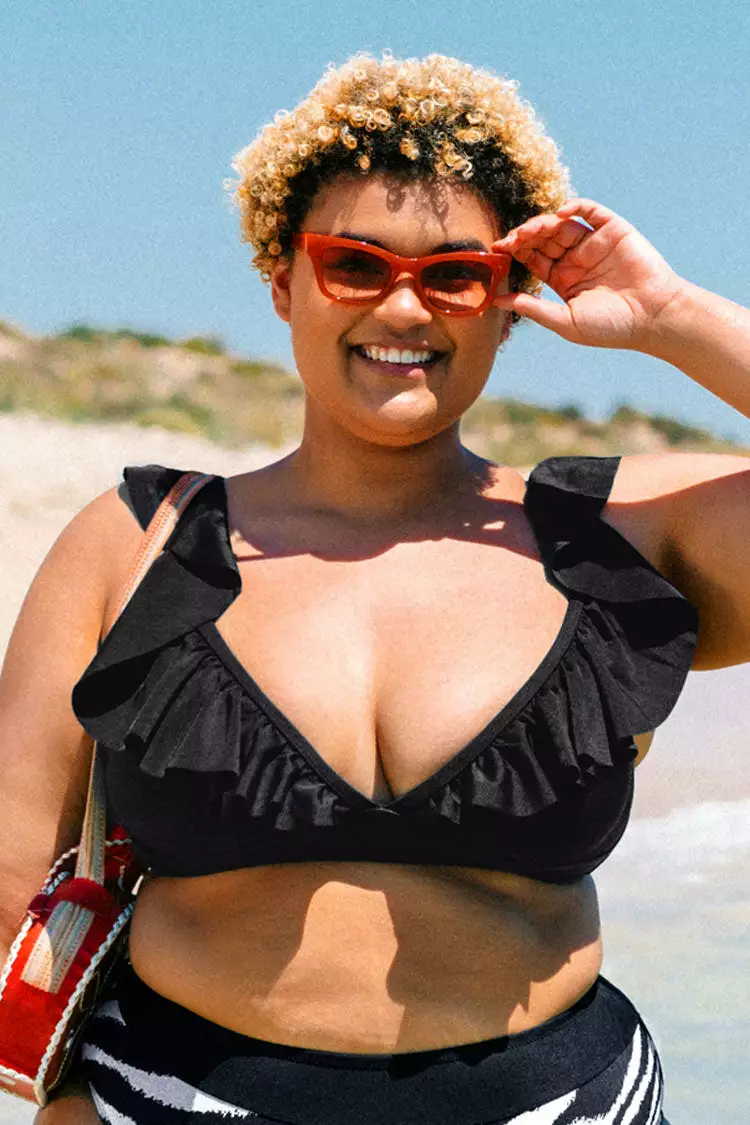 Sweet beach day style comes effortlessly in our Joelle Black Ruffle Plus Size Bikini Top. Features a flattering ruffle trim with a back hook. Mix and match with Joelle Zebra Striped Plus Size Bikini Bottom.