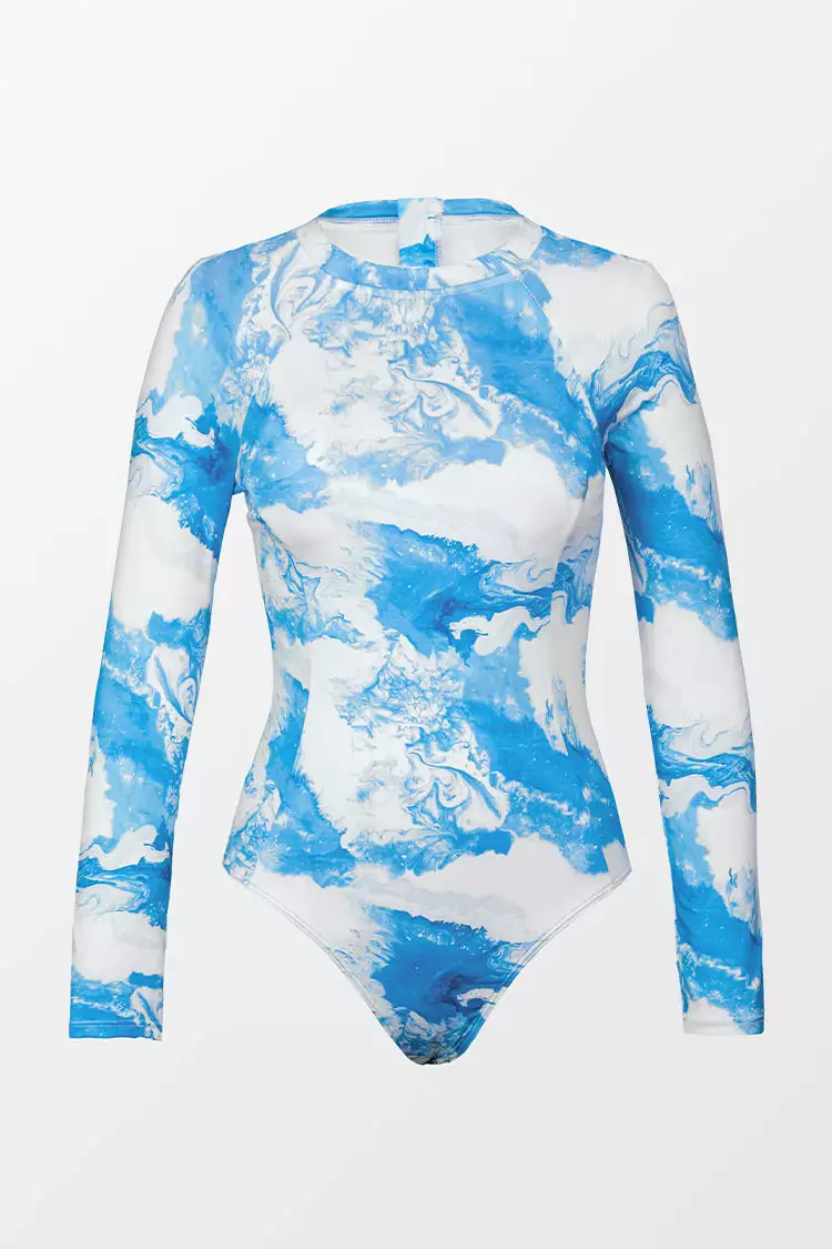 Add this classic Kaila Abstract Print Long Sleeve One Piece Swimsuit to your beachside repertoire. It is perfect for preventing sunburn and bruising. The gorgeous abstract print adds new a fun new take to the traditional silhouette.