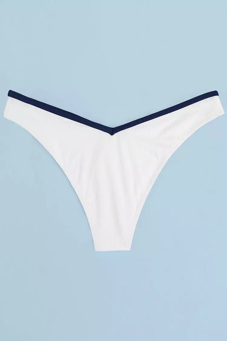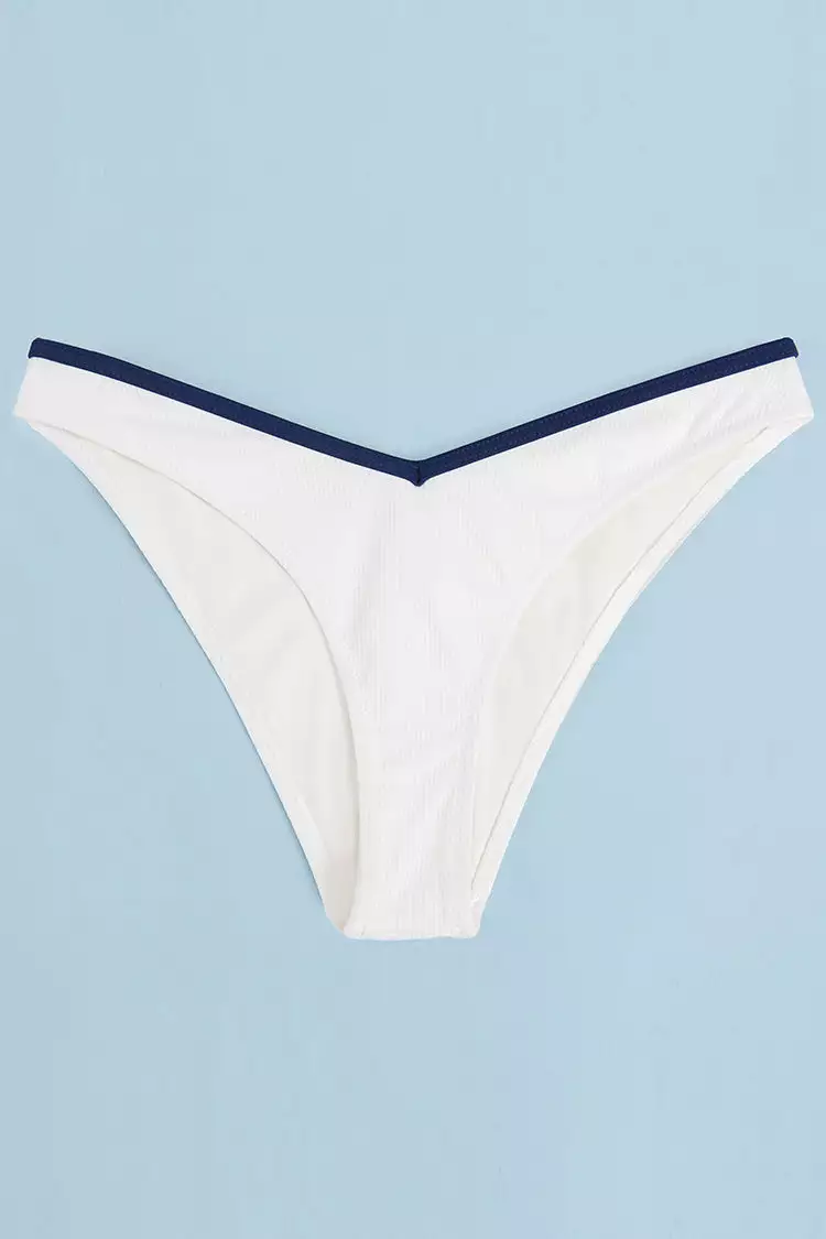 Show off your curves in Lyanna White Rib Contrast Trim Bikini Bottom. Flattering leg cut to highlight your legs. Wear with Lyanna White Rib Underwire Bikini Top to complete this look!