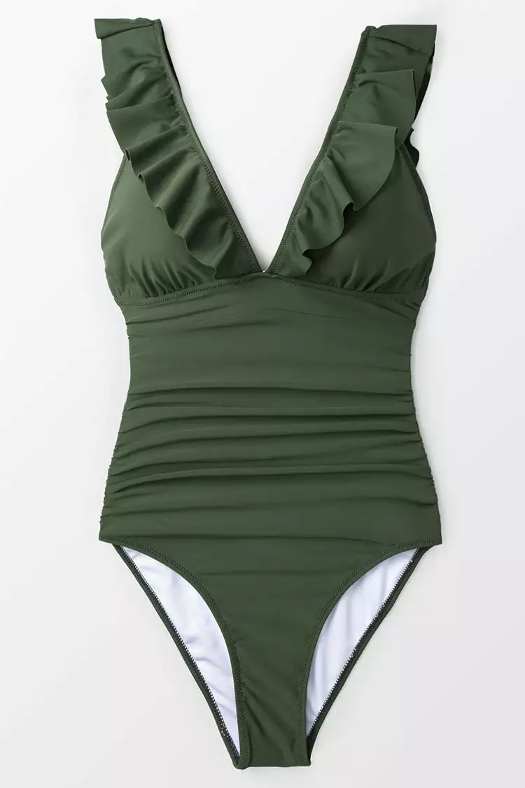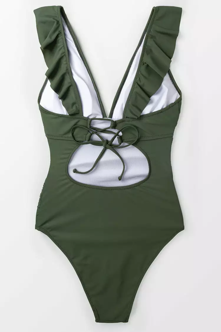 Add a playful touch to your swimwear style with our Moss Green Ruffle One-piece Swimsuit. Plunging V-neckline gives this one-piece swimsuit an eye-catching look. The back lace-up detail lets you find your perfect fit with every wear.