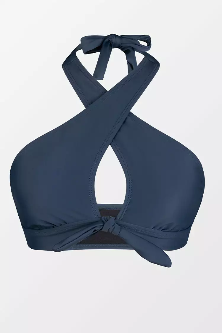 Cross halter straps and a keyhole detail bring an elevated look to this navy bikini top.