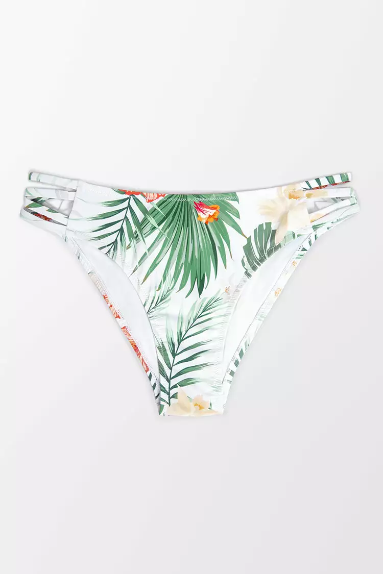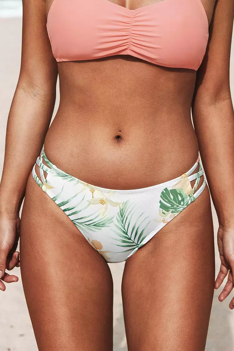 Get your sun-kiss glow in our Paola Tropical And Floral Bikini Bottom, featuring strappy cut-out details on the sides. Match with our Paola Ruched Front Crisscross Bikini Top.