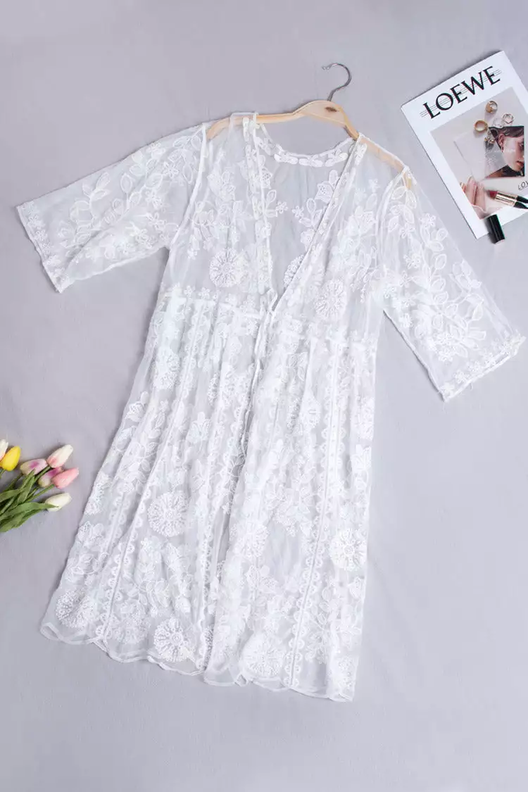 Our Persephone Tie Waist Half sleeves Kimono Cover Up is the perfect choice for a sunny beach day. Detailed with white embroidery, it has a loose and fit and matches with pretty much everything.