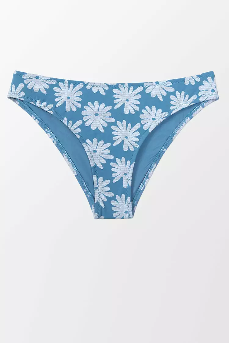 Feel super cute in this Peyton Floral Low Waisted Bikini Bottom. White flower print on blue, fresh and lovely. Pair it with Peyton Hollow Out Criss Cross Back Tie Bikini Top.