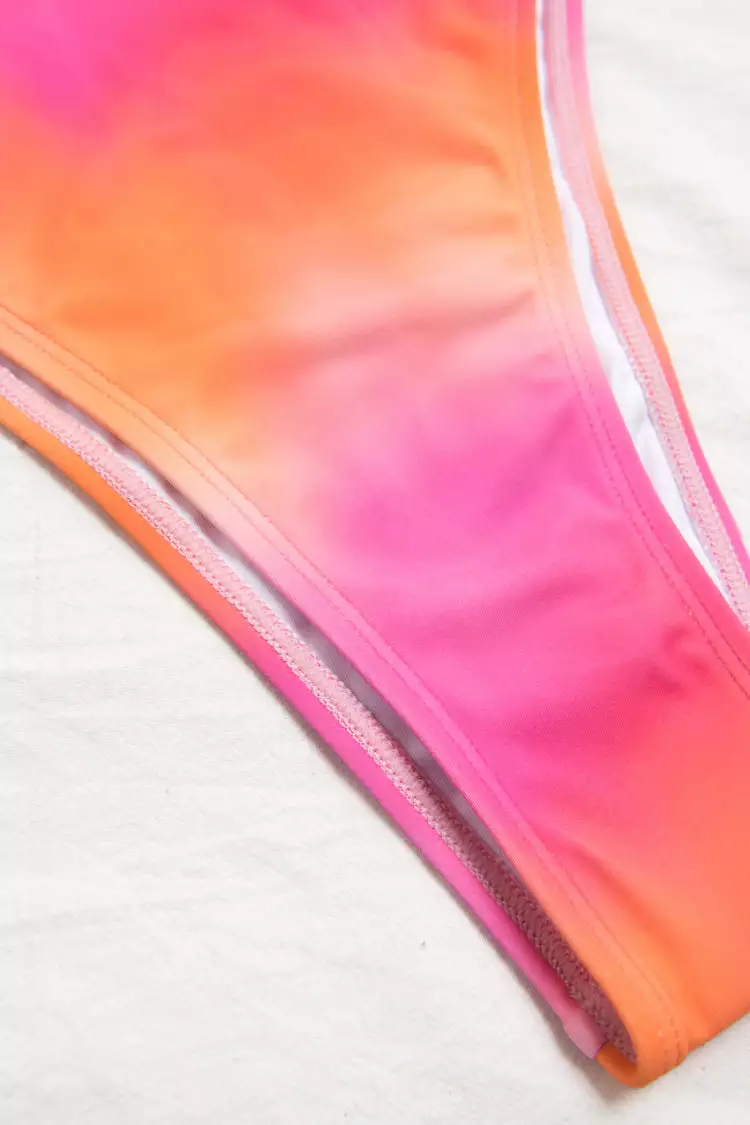 Give your swimwear look an artsy update with the Radiant Sun Ombre Bralette Bikini Top & High Waist Bikini Bottom. This eye-catching set features a classic scoop neckline and scoop back design. Complete the look with the matching high waist bottom.