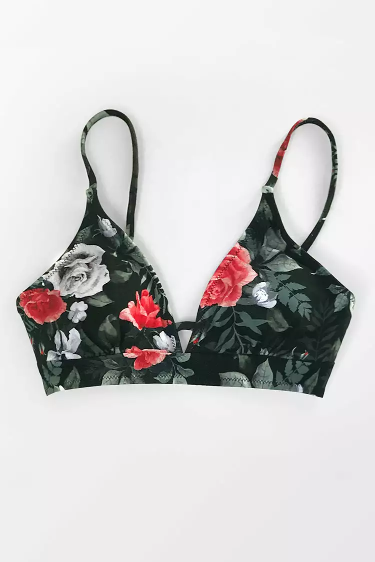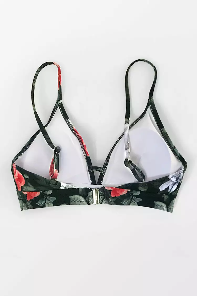 Make a splash in our Red Floral V-Neck Bikini Top. This bathing suit contrasts black background with a bright floral print for a fun tropical-inspried look. The bikini top has adjustable straps so you can easily adjust the fit and padded cups for added support.