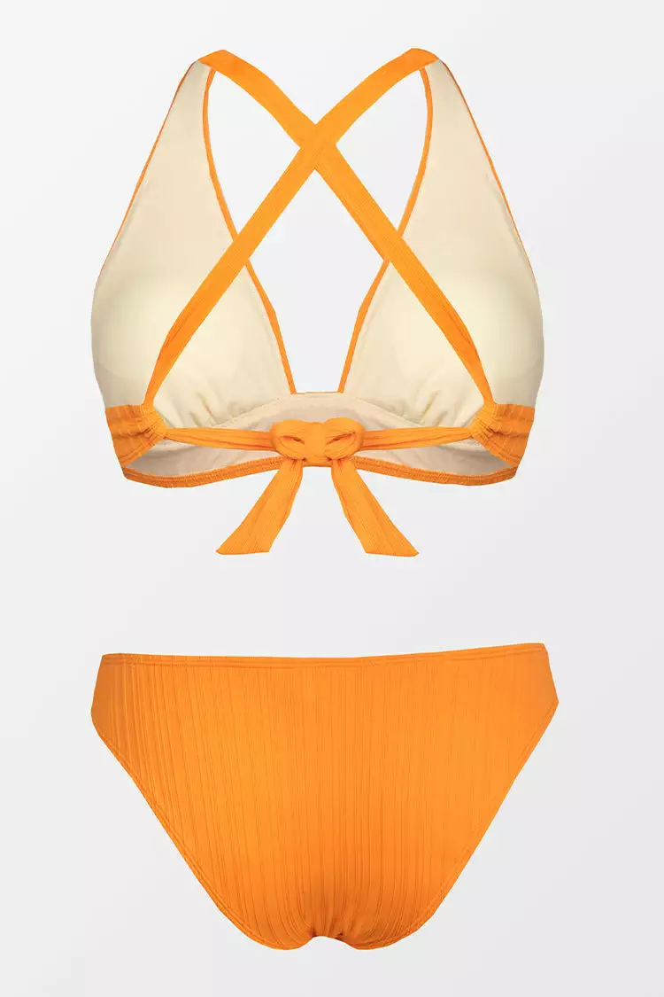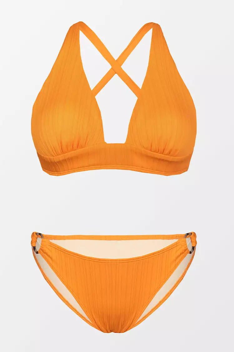Our classic Tall tri bikini top is back in our retro textured rib fabric. The bikini top features adjustable cross back straps to give you a custom fit. The matching bikini bottom has a low-rise hipster silhouette with classic bum coverage and is updated with rings at the sides to elevate the style.