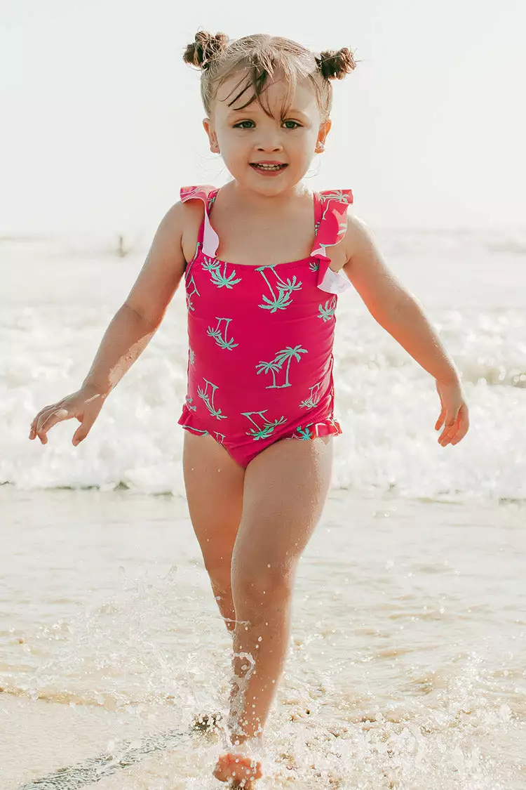 Your girl can chase the waves in our Reyna Palm Tree One Piece Swimsuit For Toddler Girls And Girls. Features a very cute palm tree print. Detailed with ruffle hem and crisscross tie back.