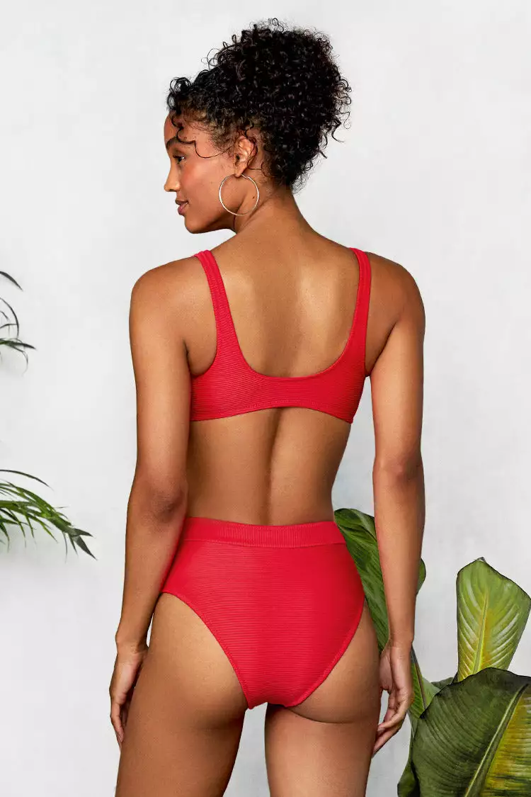 Hit the beach in our Ribbed Red Bowknot Bikini set. The bikini top has a front bowknot detail with removable padded cups. The bottom features moderate coverage with a high rise silhouette.