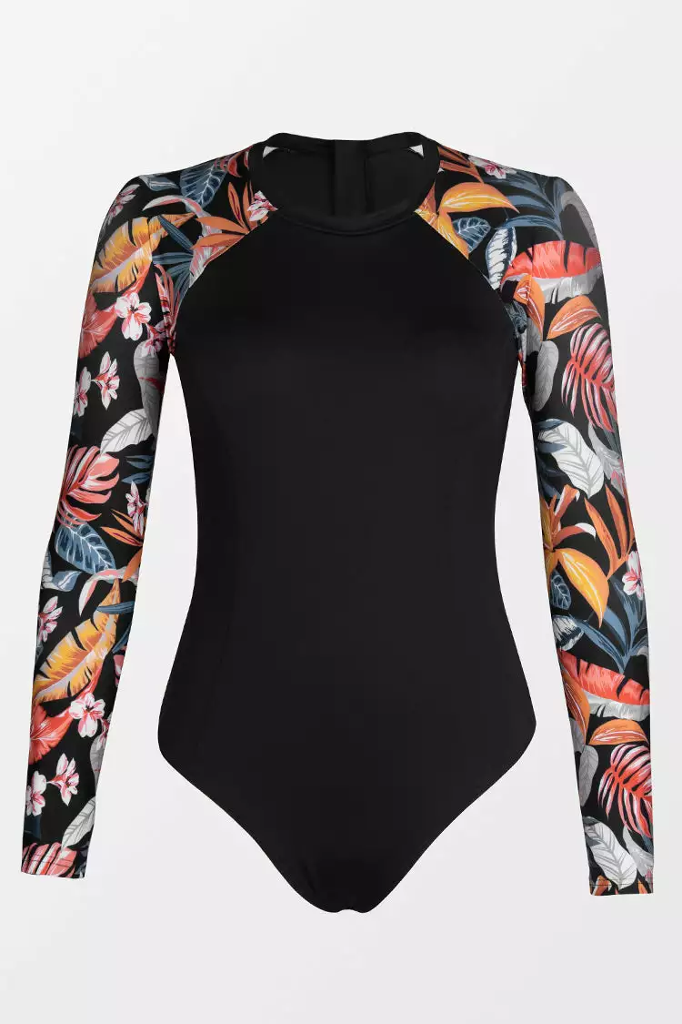Give your look a chic update with Sariyah Tropical Zipper Long Sleeve One Piece Swimsuit. Features raglan long sleeves, back zip, all black bodice and tropical print on the sleeves add more fun.