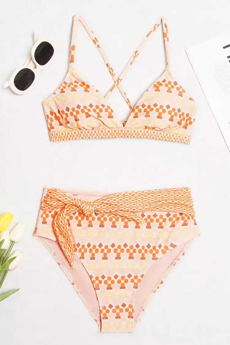 Stefanie Geo Print Lace-up Back Bikini is cute and flirty. Features geo print and lace-up back tie. The high waisted bottom has tie front detailing.