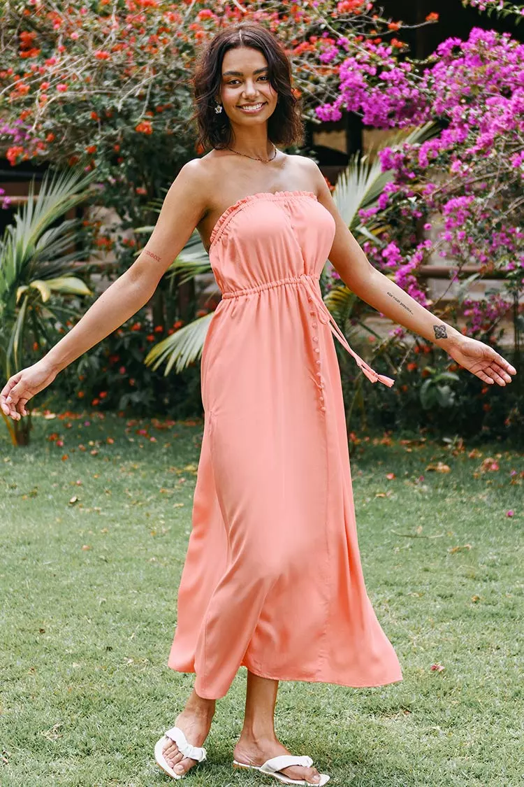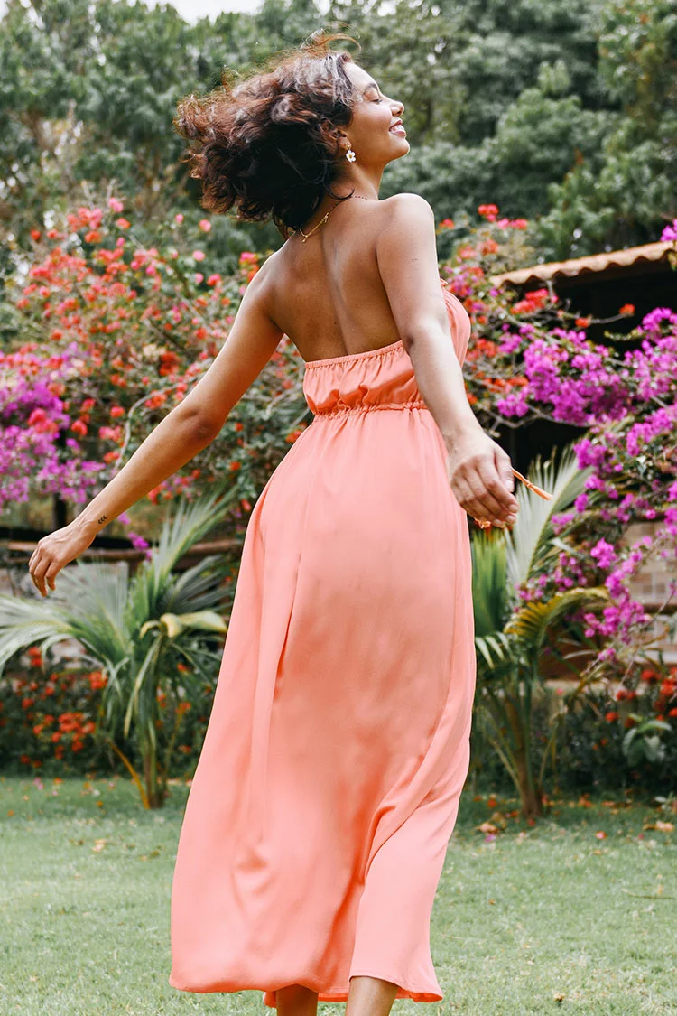 Sunny days and the Tara Halter Frill Backless Maxi Dress are sure to make you feel amazing! Features with thin self tie on the neck, frill on the edge, backless design which tops a full maxi skirt.