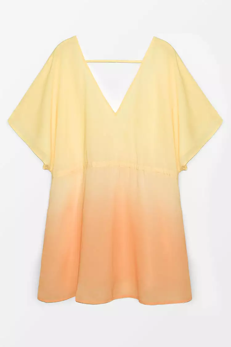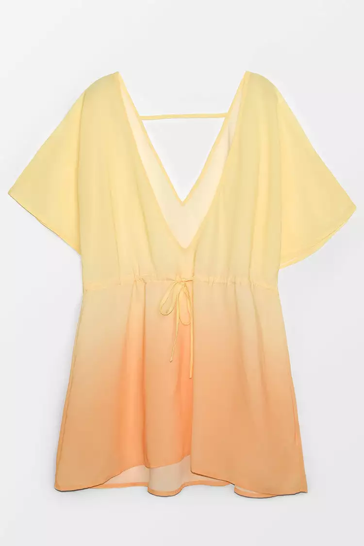 Wear this Tiara Ombre Print Plunge Drawstring Cover Up on and off the beach! It features soft fabric in a beautiful dip-dye print for that flowy, dreamy look, and the sexy plunging V neck shows off the bikini underneath and an added drawstring for a better fit.