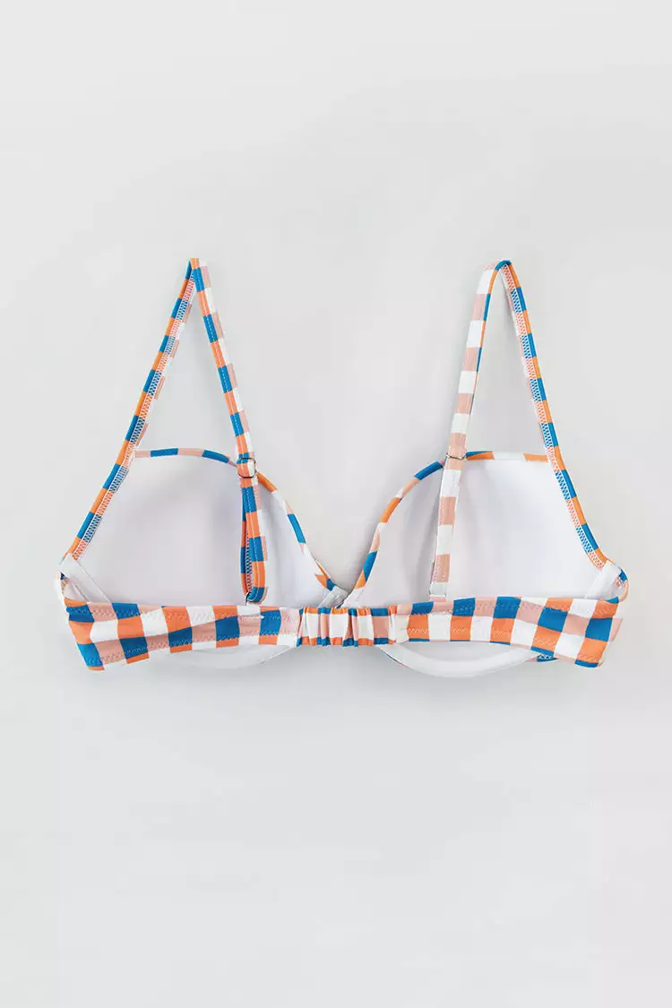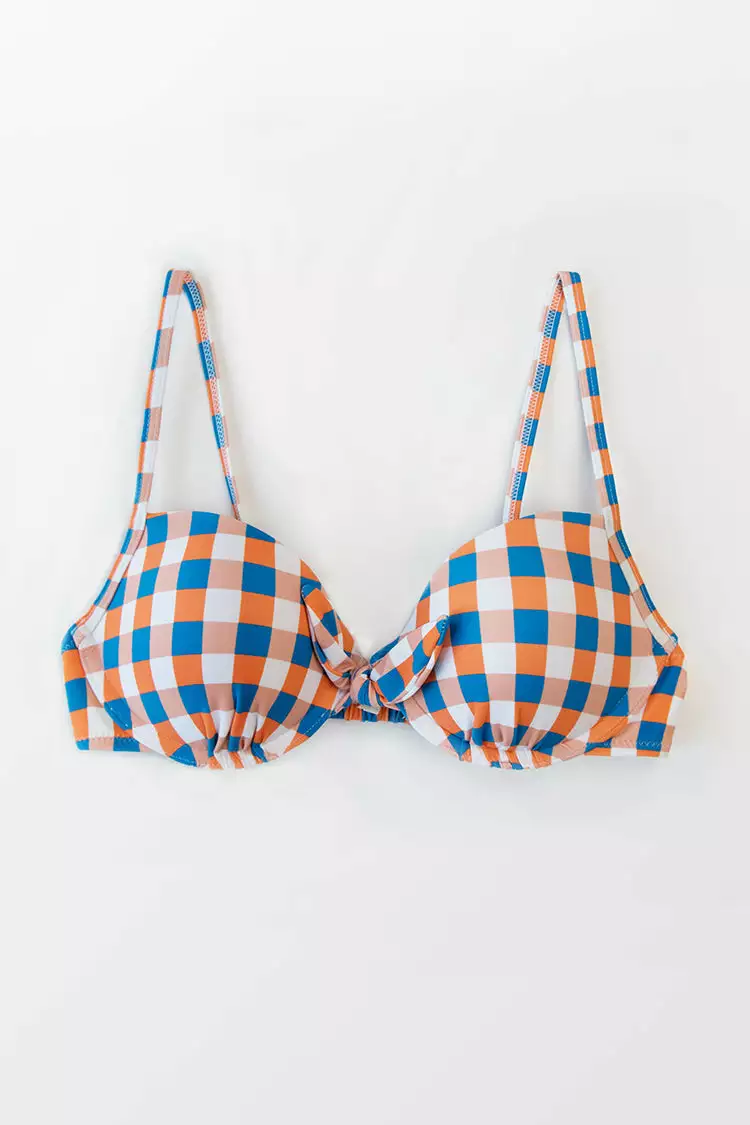 Feel your best in our Tricolored Plaid Knotted Bikini Top. Features a knotted center front with adjustable shoulder straps to adjust it to your perfect fit.