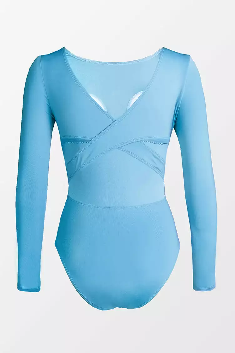We are loving our Tyra Blue Criss Cross Long Sleeve One Piece Swimsuit. Criss cross and cut out detail on the back add a touch of fun. Long sleeves prevent sunburn and bruising.