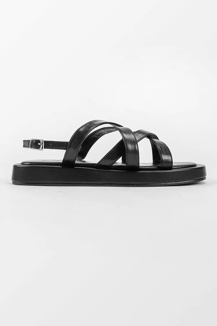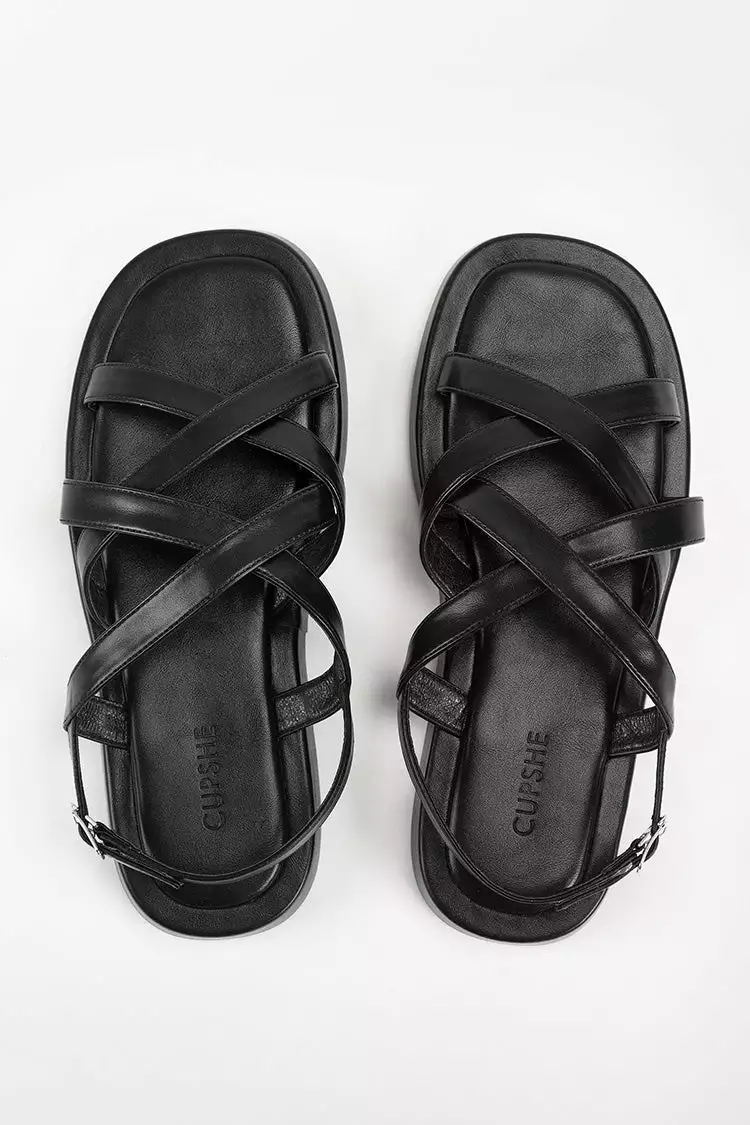 Our Vineyards Black Crisscross Strap Ankle Buckle Sandals with flat heel design. Adjustable ankle buckle design with cushioned footbed for a comfot fit. Open-toe design offers easy wear. So cool sandals featured in a flatform-style with crisscross strappy detailing.