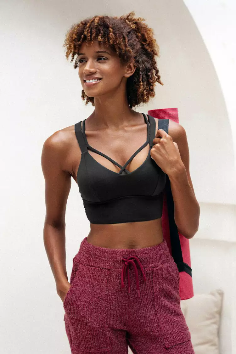 This Whirly Strappy Criss Cross Sports Bra is perfect for your chill day collection. Featuring a cross-back design, scoop neckline and padded detailing. Wear with matching leggings to complete the look.