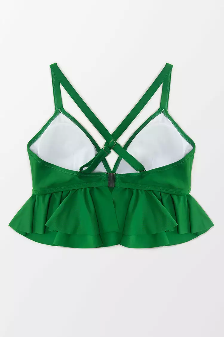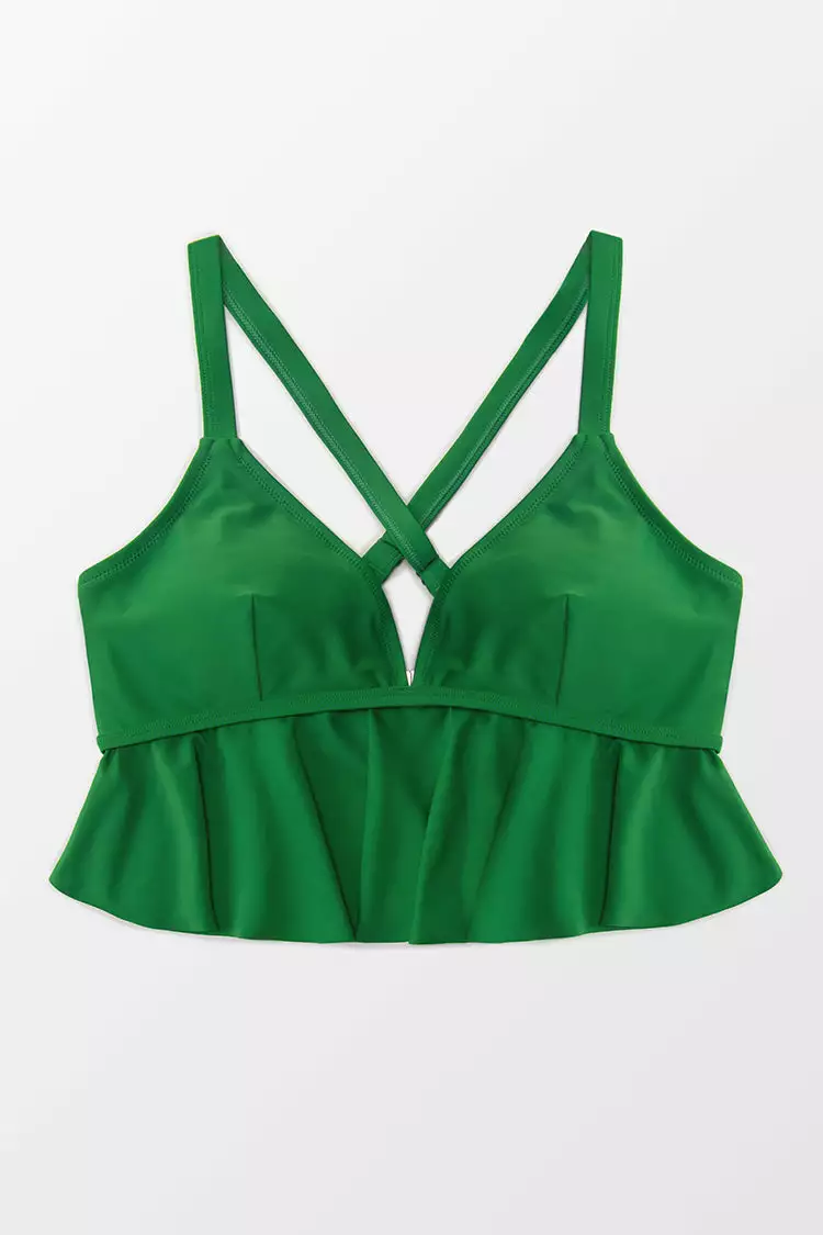 Feel cute and comfy in our Zoe Ruffle Crisscross Plus Size Bikini Top. This bikini top has long ruffles under the bust for extra coverage. Mix and match with our Zoe Floral High Waisted Plus Size Bikini Bottom.